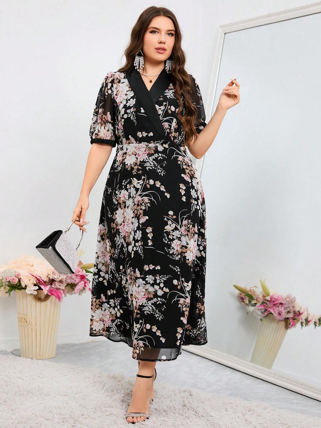 Plus Size Floral Print Dress With Shawl Collar And Puff Sleeves Long Evening Dresses