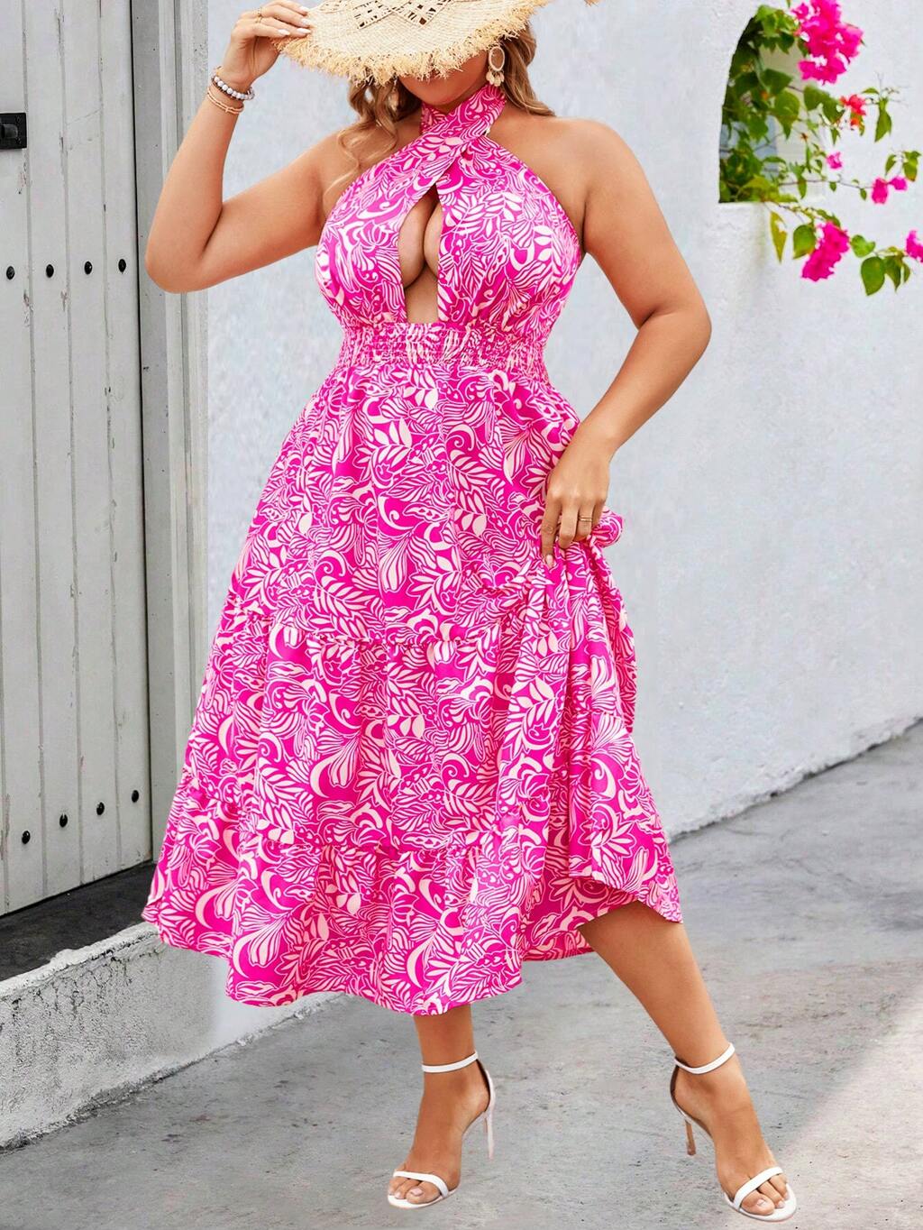 Plus Size Women's Tropical Plant Printed Halter Neck Hollow Out Cross Waist Mini Dress