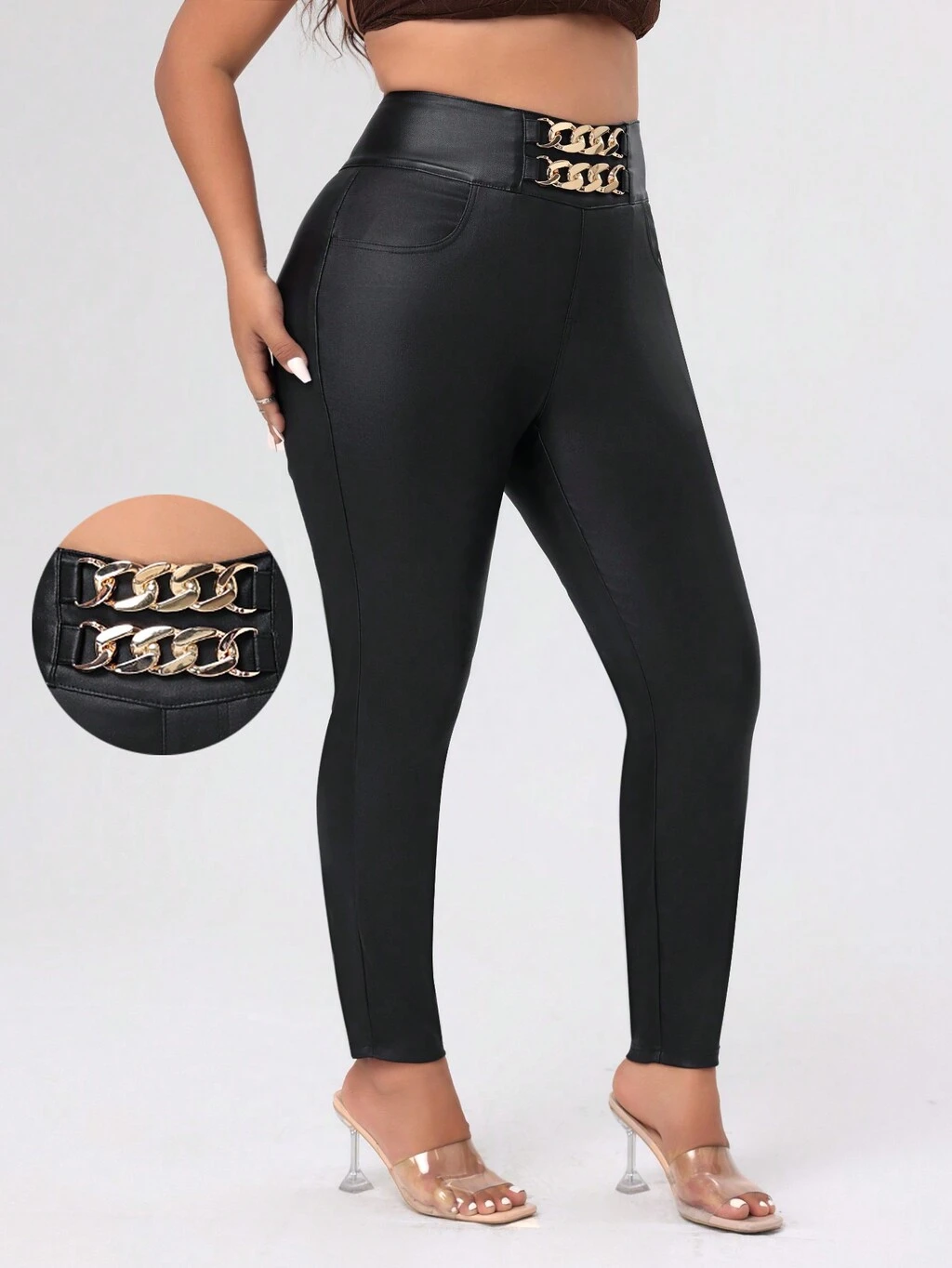 Plus Size Metallic Chain Decorated Black Coated Skinny Pants With Elasticity Fall Cloth For Women
