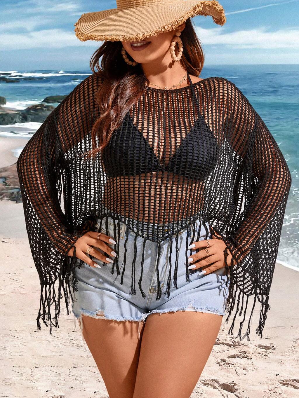 1pc Plus Size Fashionable Hollow Out Fringed Bell Sleeve Sweater Knit Pullover Fall Winter