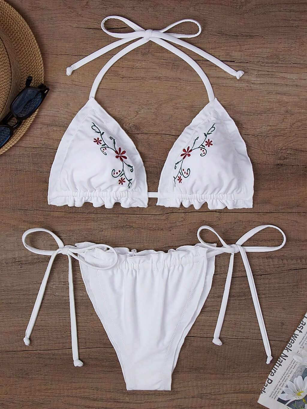 Flower Embroidered Halter Top With Solid Color Bikini Bottom Set, Swimwear, String Bikini Set Bathing Suit Beach Outfit Summer Vacation