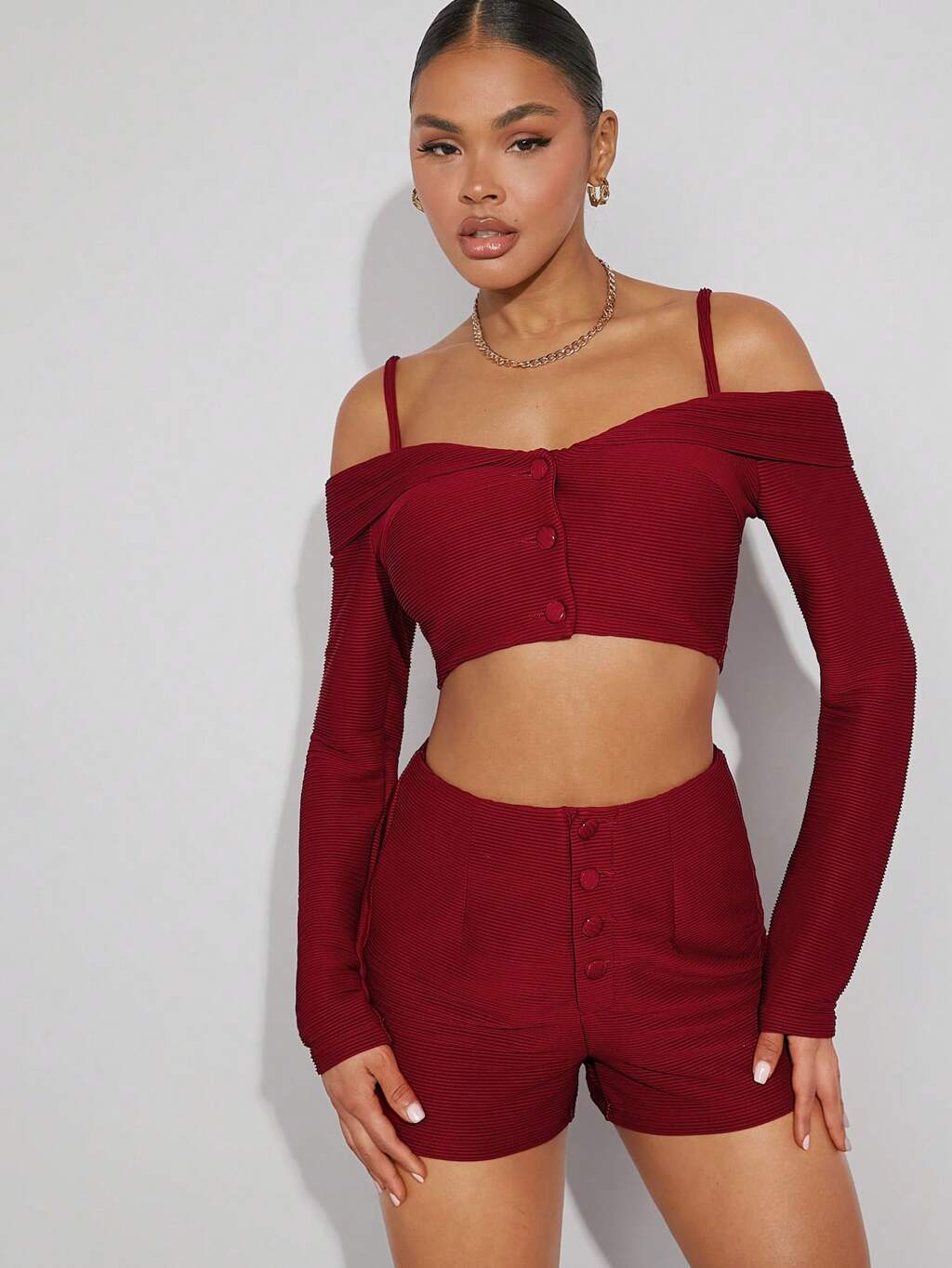 Button Foldover Crop Top & Shorts Two Pieces Set