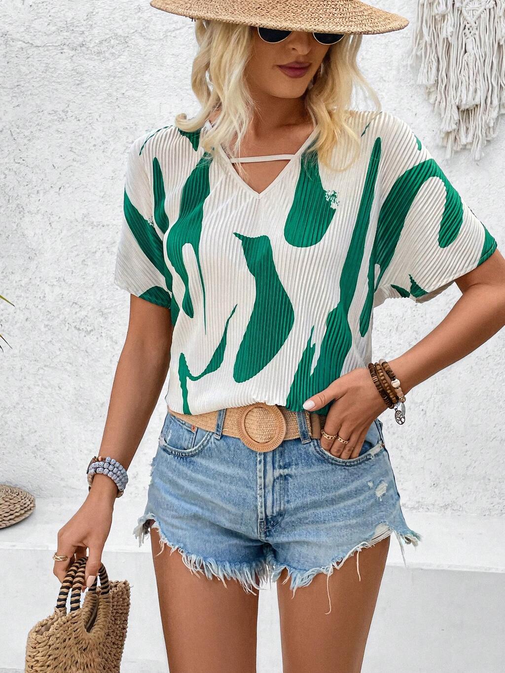 Women's Printed Pleated Batwing Sleeve Blouse For Summer