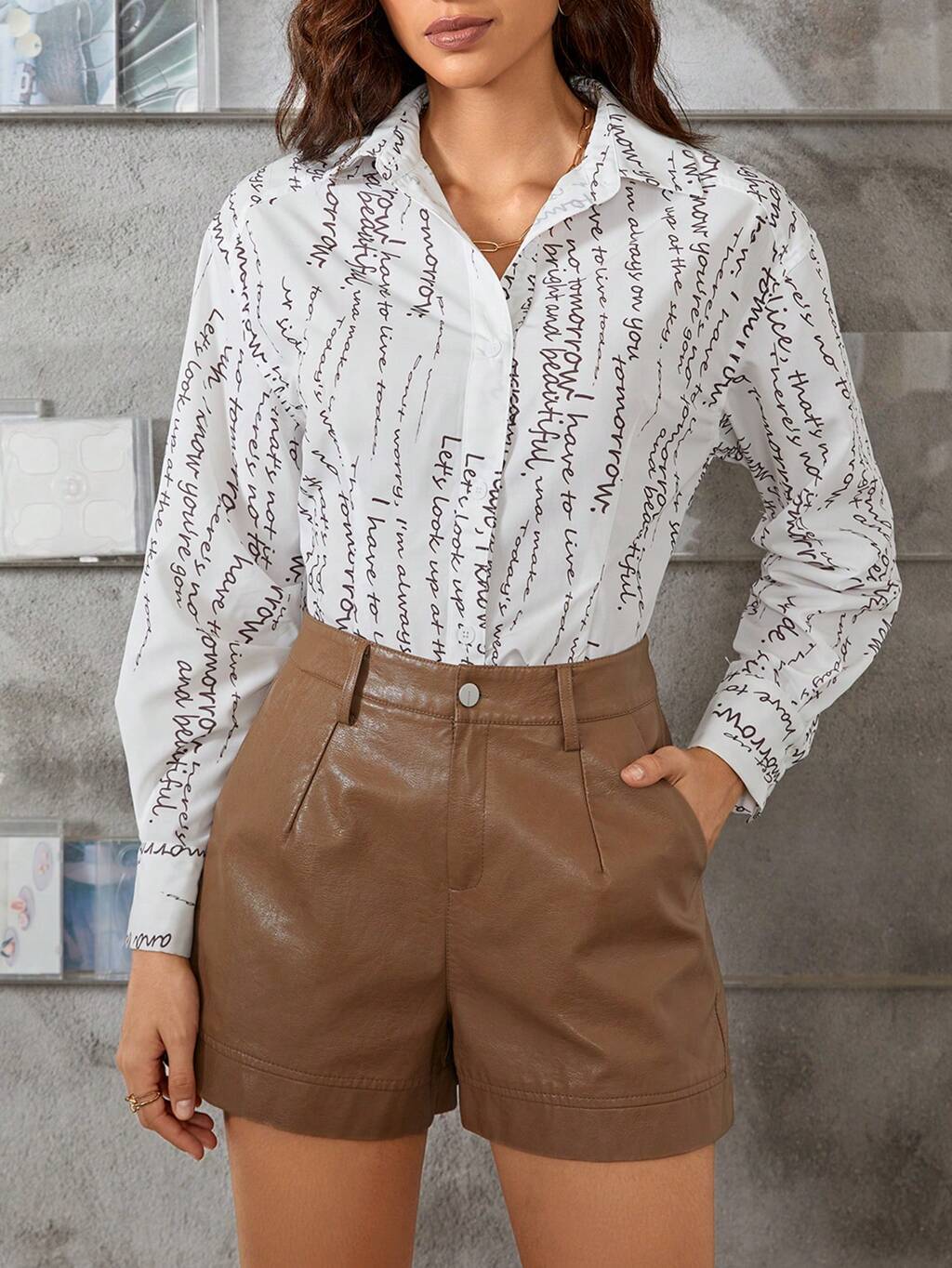 Solid Lace Trim Button Front Shirt Winter Elegant Brown