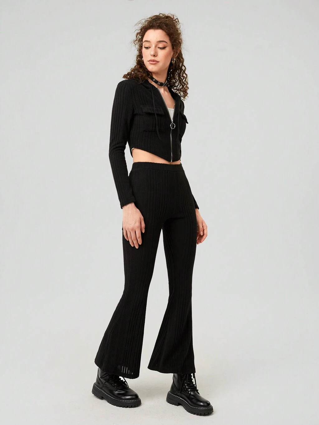 Women's Zipper Closure Drawstring Jacket And Flare Pants Two Piece Set