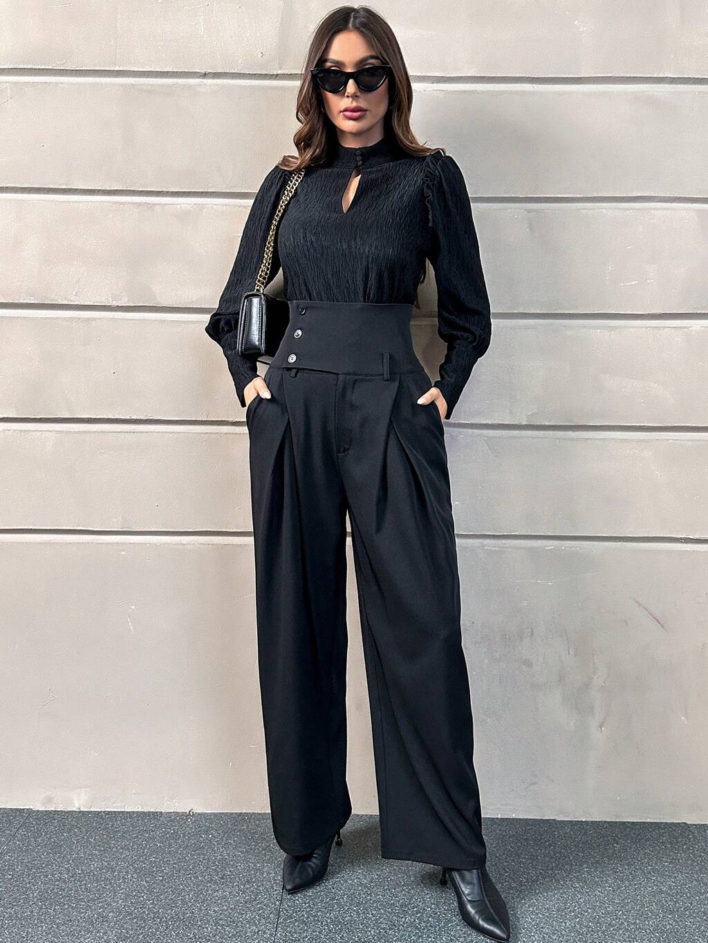 Keyhole Neckline Lantern Sleeve Top & Wide Leg Pants