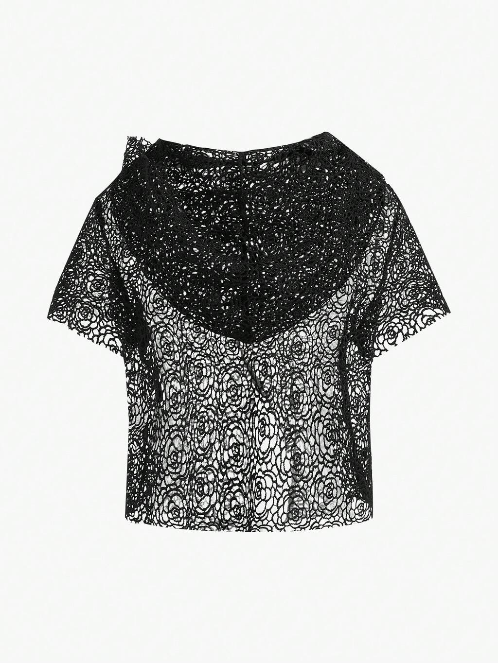 Hollow Out Asymmetrical Hem Sheer Hooded Top Without Bra