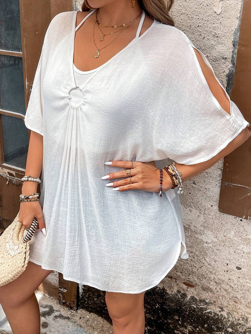 Plus Size Cut Out Basic Casual T-Shirt, Suitable For Summer, Dating, Casual, Shopping, Streetwear, Going Out, Vacation, Beach, Easy To Match&Looks Slim