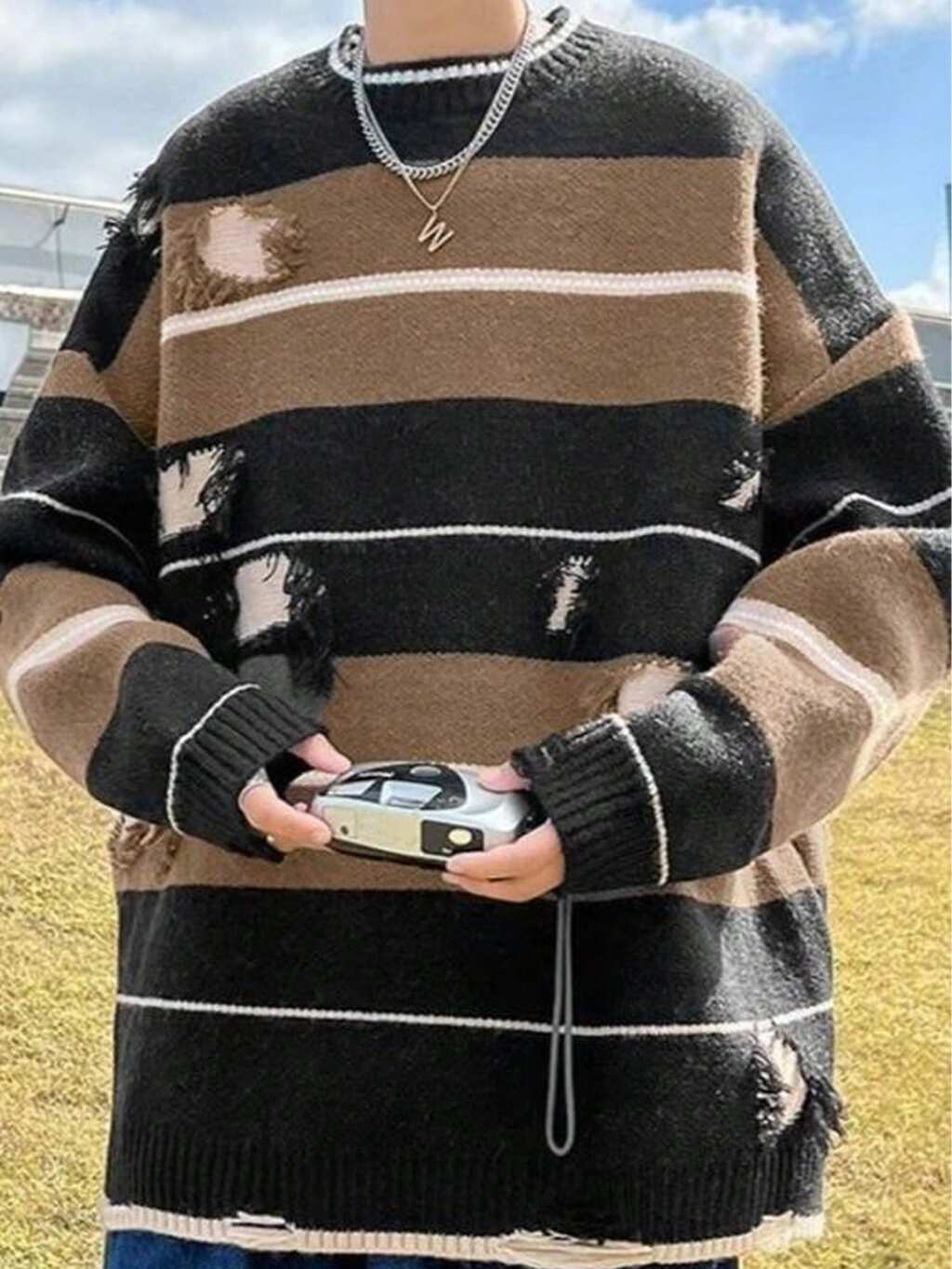 Men Striped Pattern Ripped Drop Shoulder Sweater