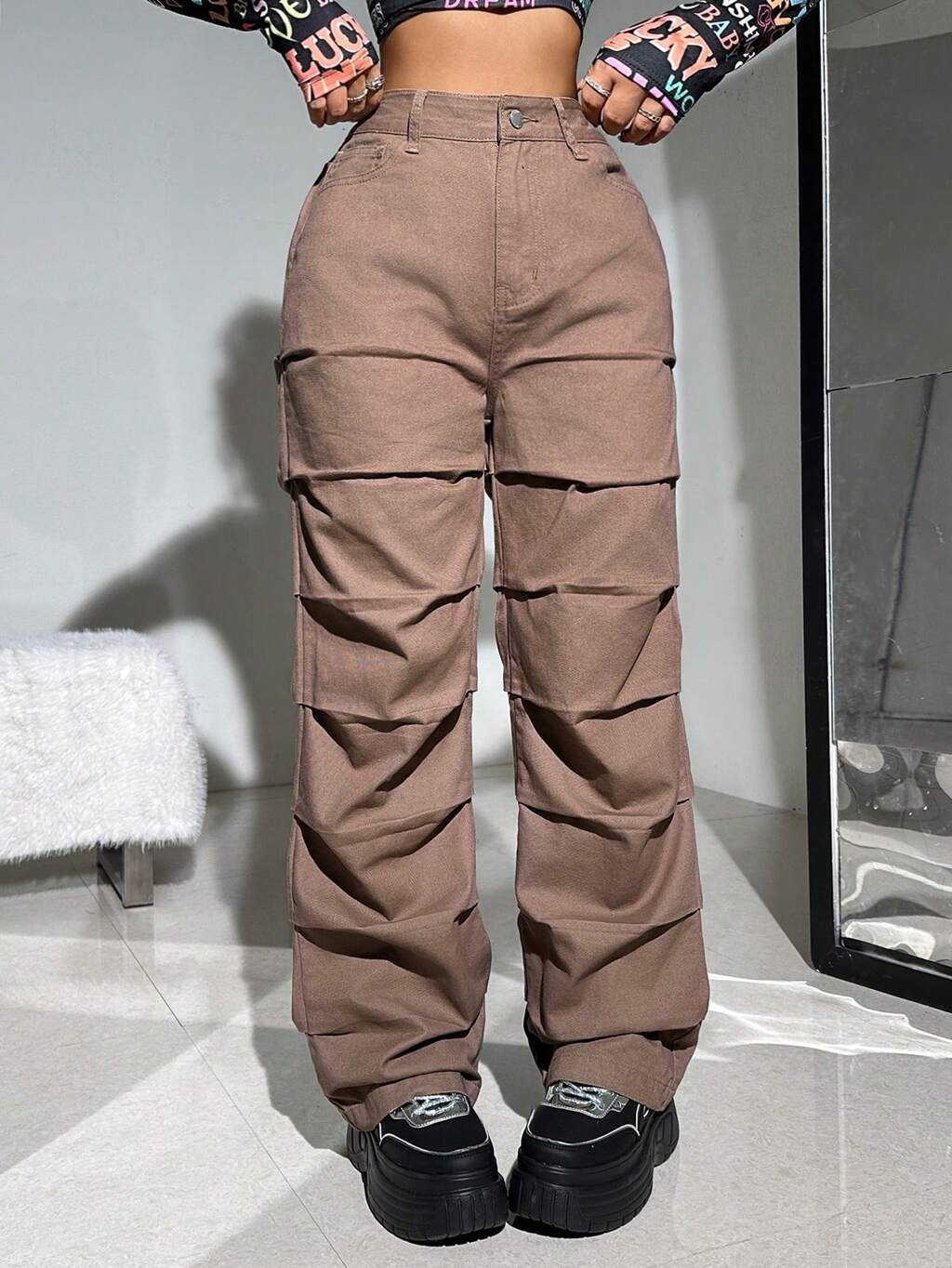 Y2k Brown Loose Women'S Casual Fit Low Rise Pleated Straight Jeans