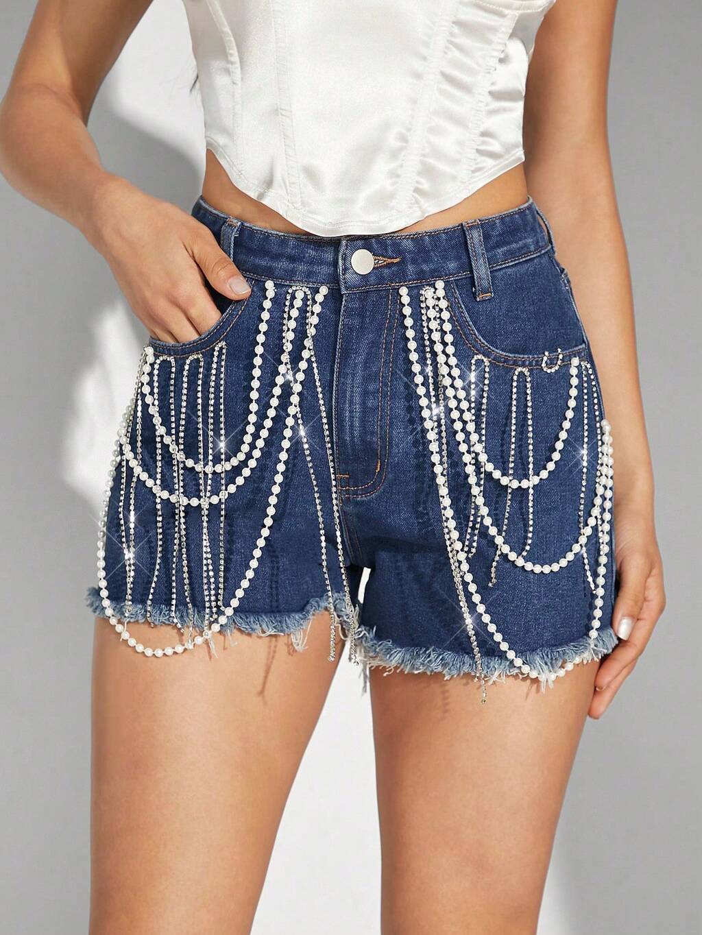 Fashion Beads & Rhinestone Fringe Embellished Frayed Denim Shorts