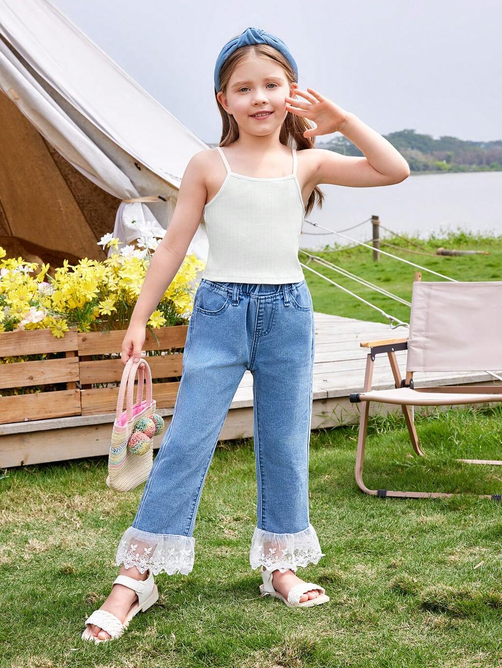 Young Girl Denim Jumpsuit With Lace Patchwork Design