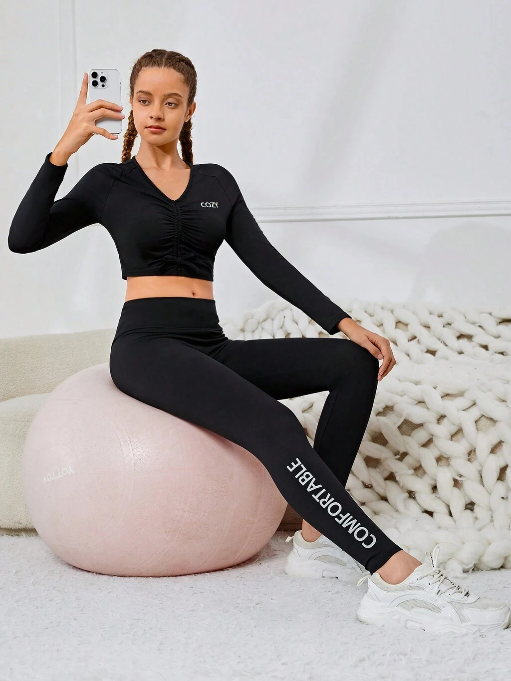Teen Girls' Knitted Letter Pattern Ruffle Trim T-Shirt And Pants Sportswear Set