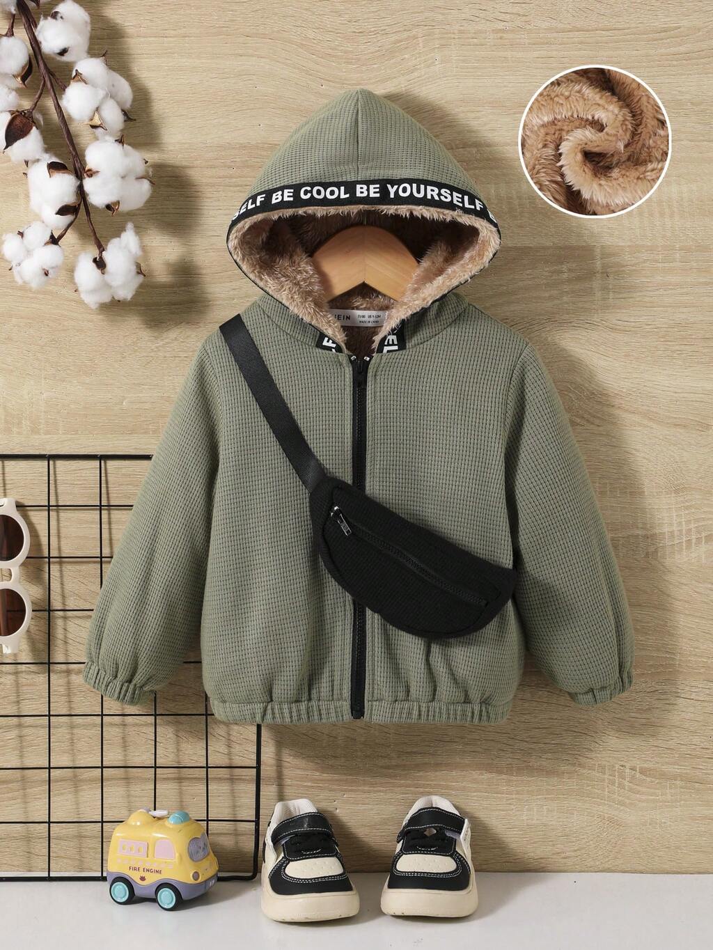 Baby Boy Letter Graphic Teddy Lined Hooded Jacket & Bag
