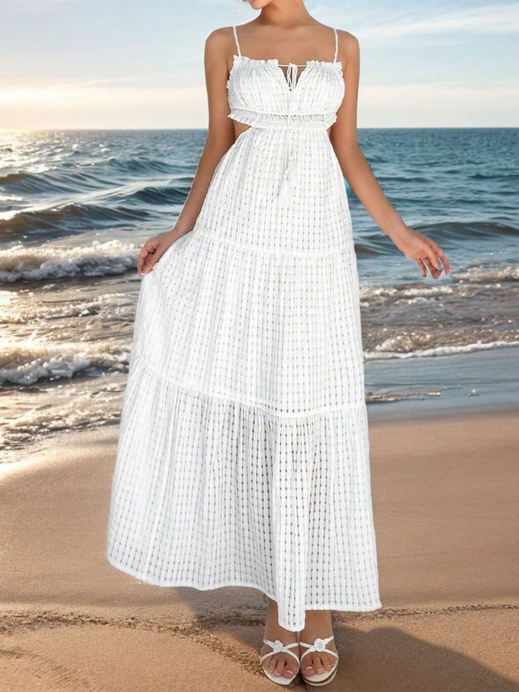 Romantic Vacation Spaghetti Strap Swing Dress With Hollowed-Out Lace Trim For Women, Spring Summer