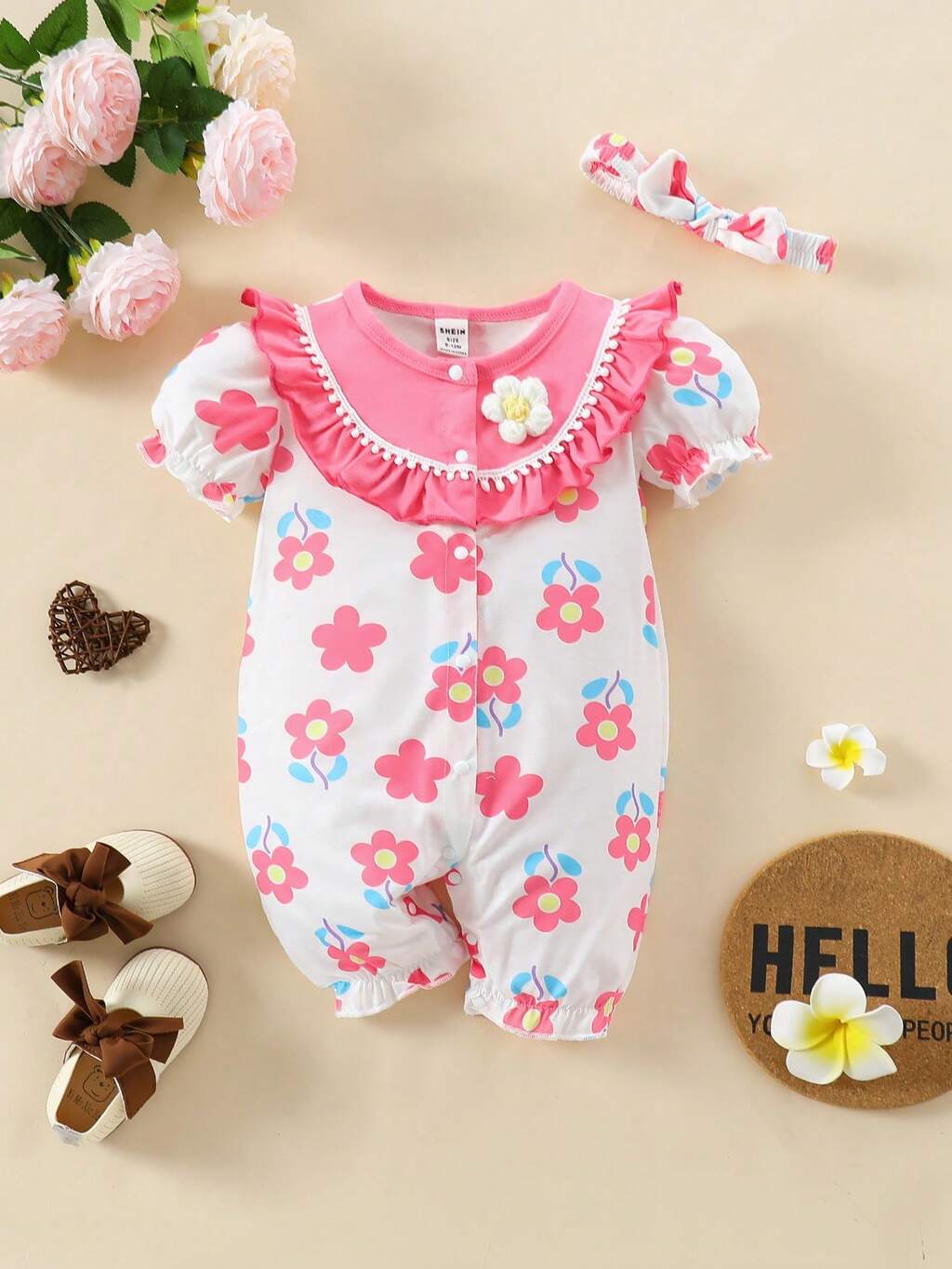 Baby Girl Summer Sweet Floral Print Romper With 3d Flower Decor & Bow Headband
