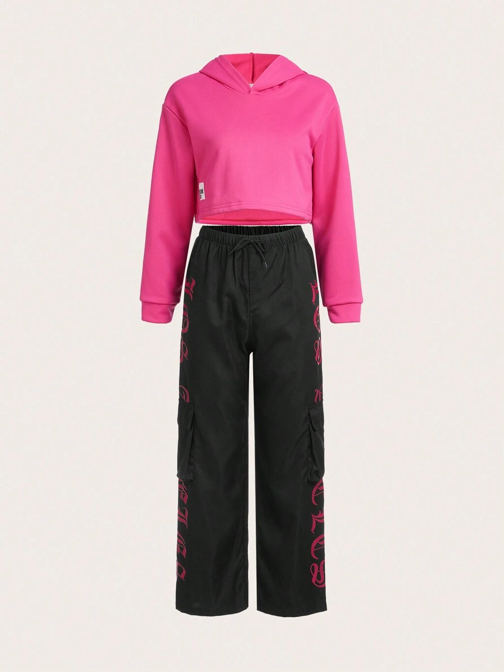 Teen Girl Japanese Letter Graphic Two Tone Hooded Jacket & Sweatpants Without Tee