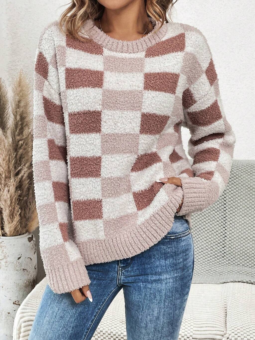 Plaid Pattern Drop Shoulder Knit Pullover Fall Winter Sweater