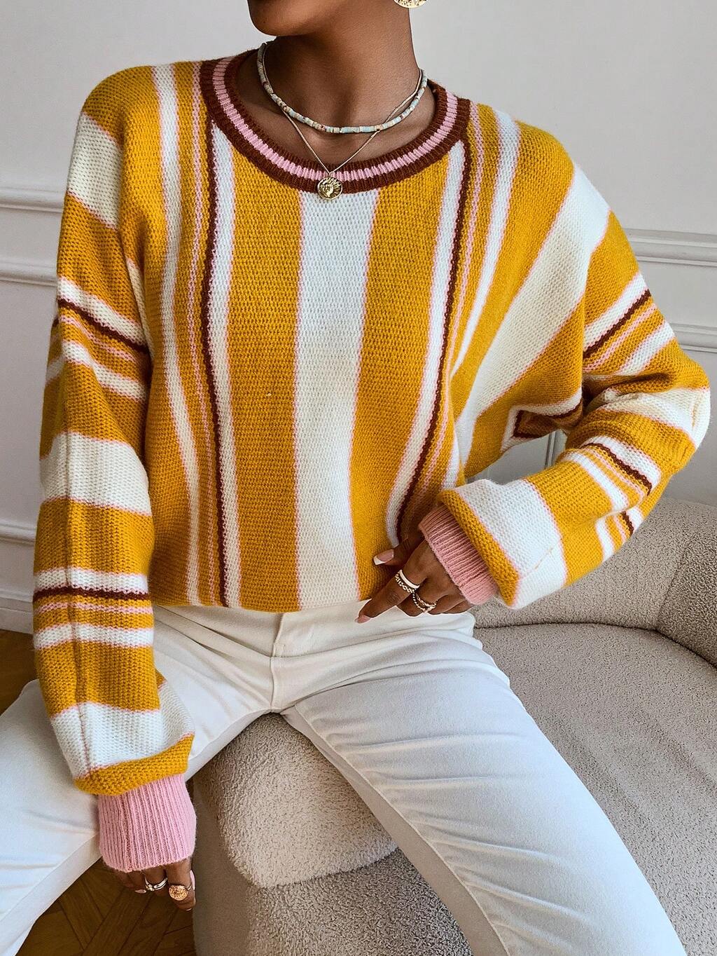 Striped Pattern Drop Shoulder Sweater Winter Casual