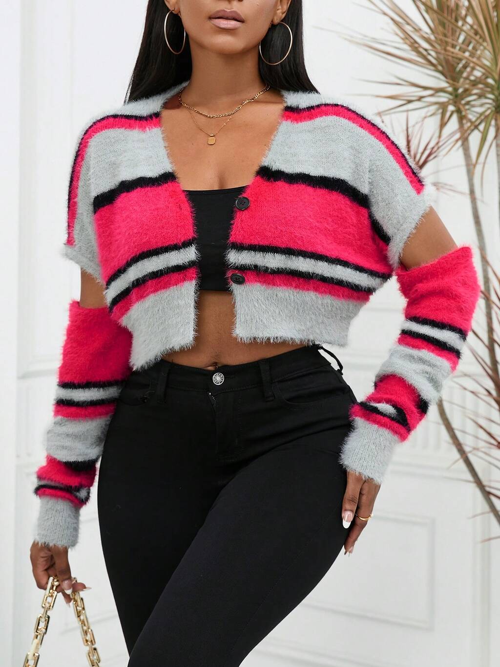 Striped Pattern Cut Out Fluffy Knit Cardigan Fall Cloth For Women