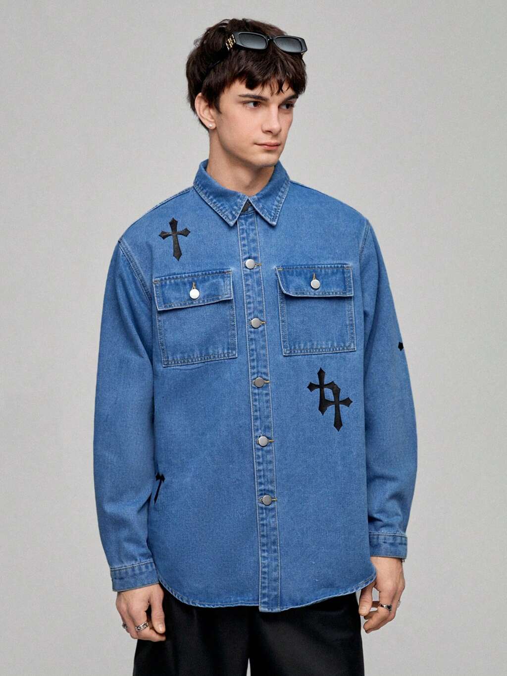 Men's Cross Pattern Long Sleeve Denim Shirt