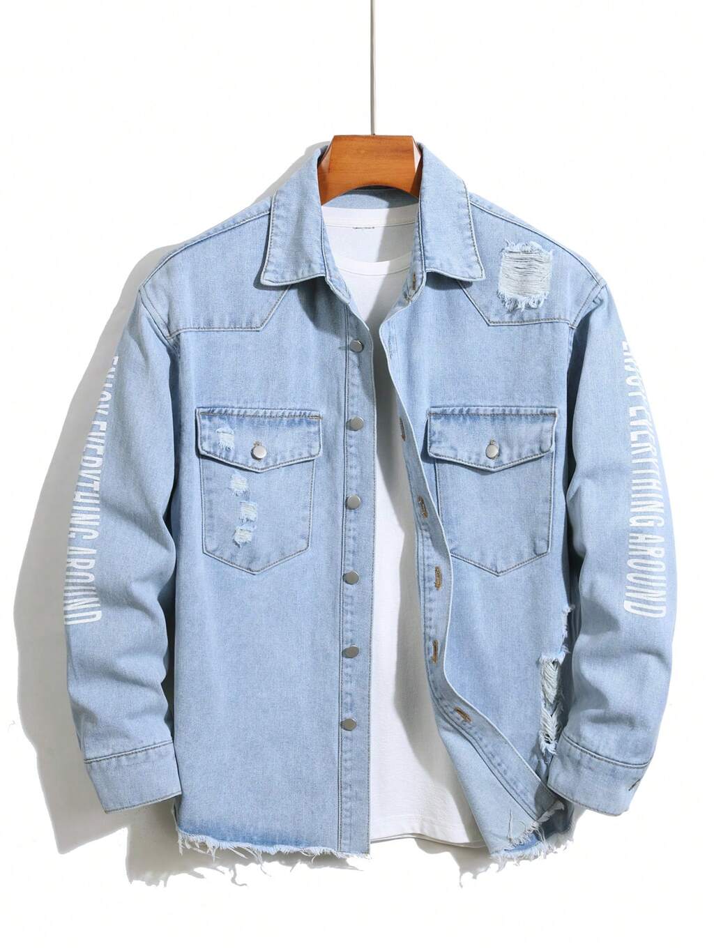 Men's Casual Button-Down Denim Shirt With Letter Print And Distressed Detail