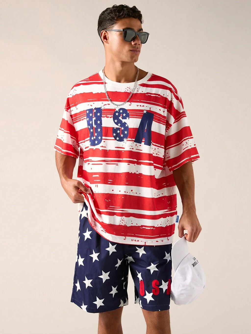 Men's Summer Casual Short Sleeve Shirt And Shorts Set With Star And Slogan Print
