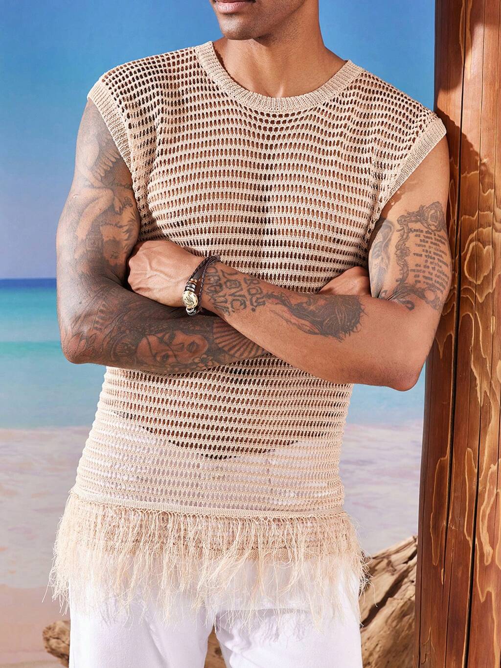 Men's Solid Color Sleeveless Knitted Crochet Sweater With Hollow Out Round Neckline