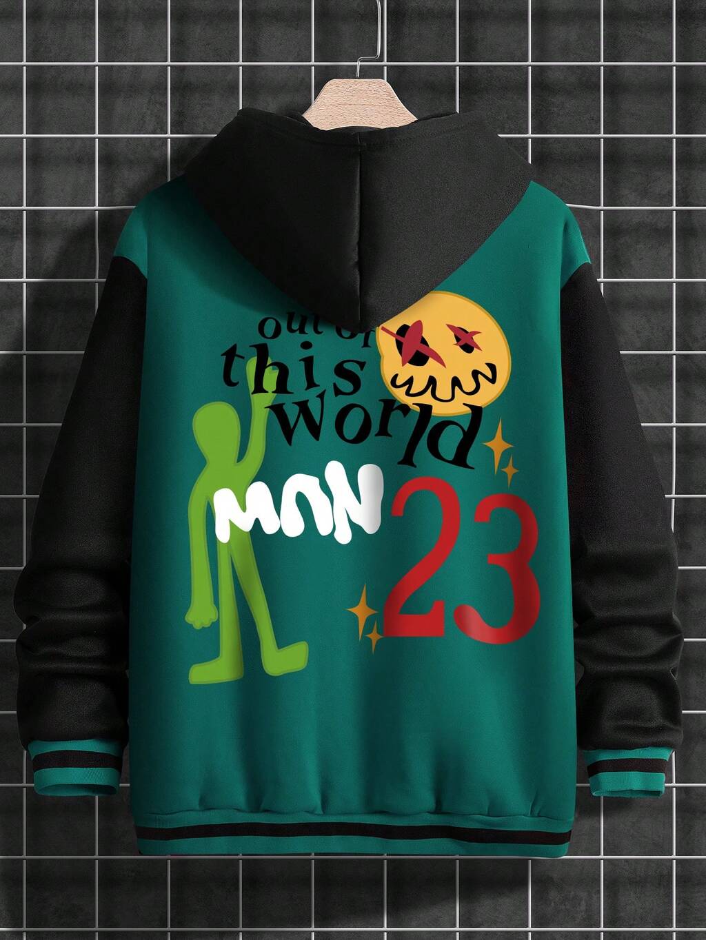 Loose Fit Men's Slogan Graphic Striped Trim Varsity Jacket Without Hoodie