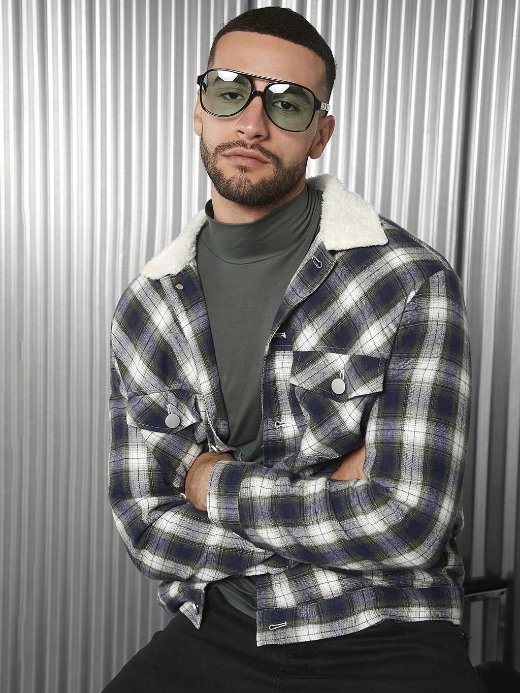 Men Plaid Print Borg Collar Flap Detail Jacket