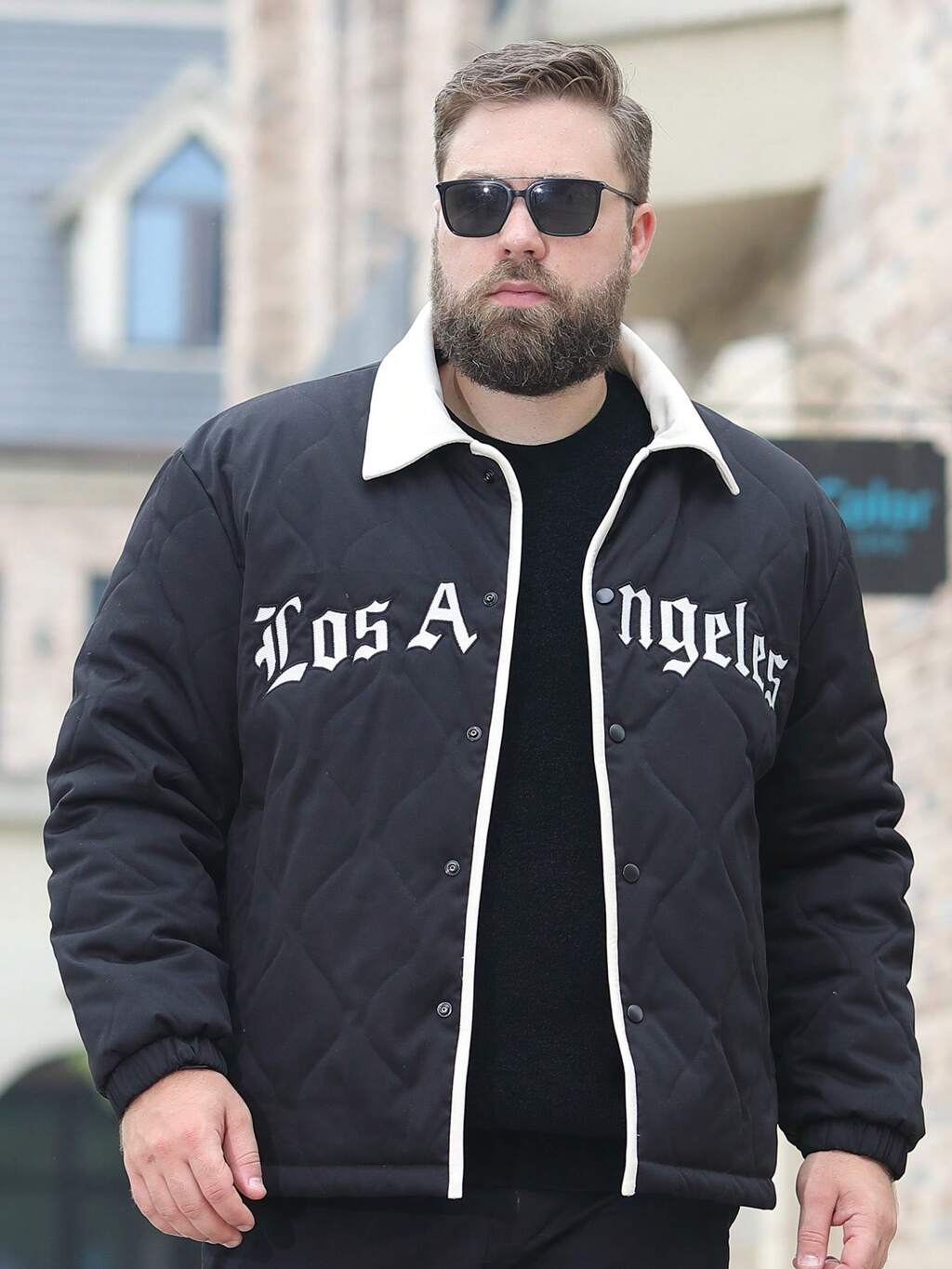 Loose Fit Men's Plus Size Quilted Coat With Letter Graphic And Contrast Collar