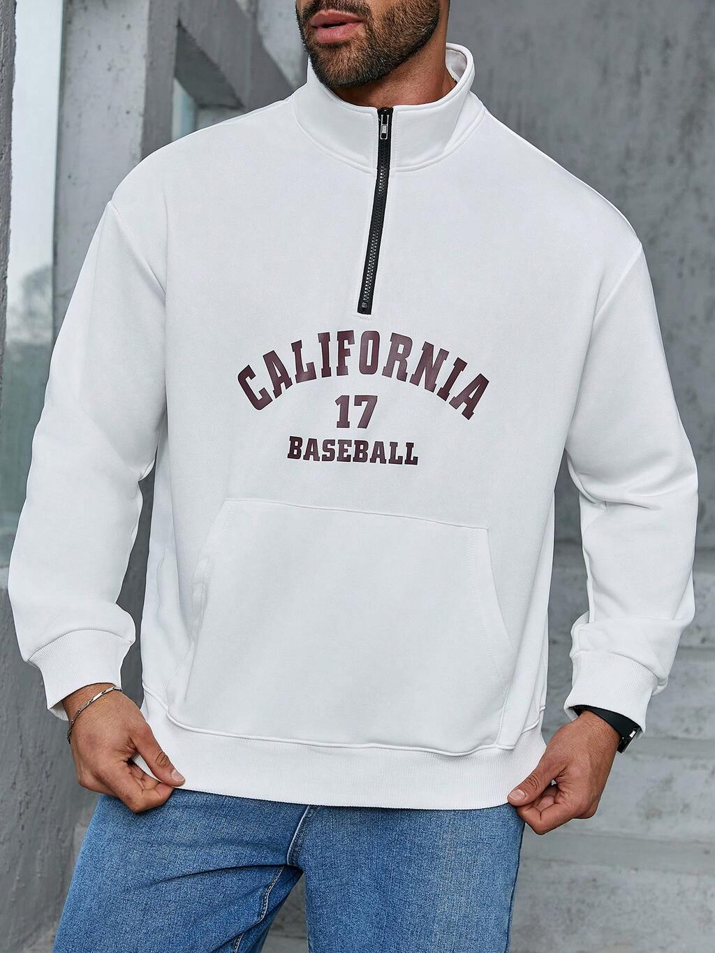 Men's Plus Size Letter Printed Zipper Half Placket Long Sleeve Casual Pullover Sweatshirt