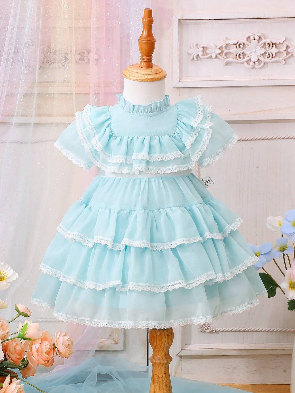 Stylish Baby Girl's Lace And Ruffle Trimmed Patchwork Dress With Decorative Trim