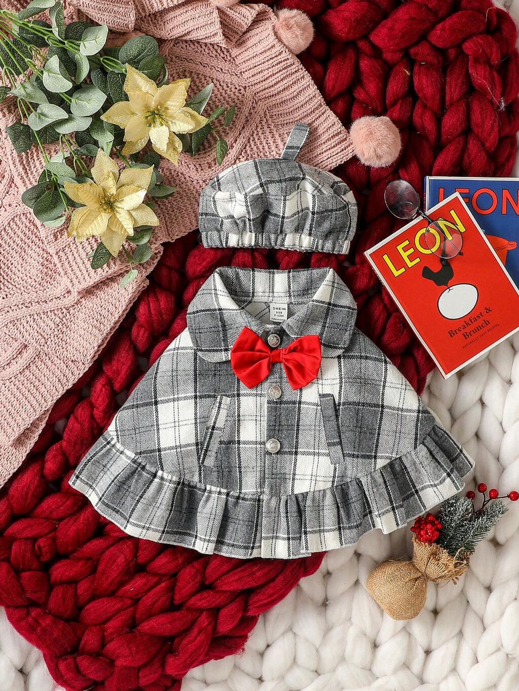Plaid Ruffle Bow Collar Open Front Cape Coat + Pumpkin Hat, Fashionable Elegant Outerwear For Baby Girls, Autumn/Winter
