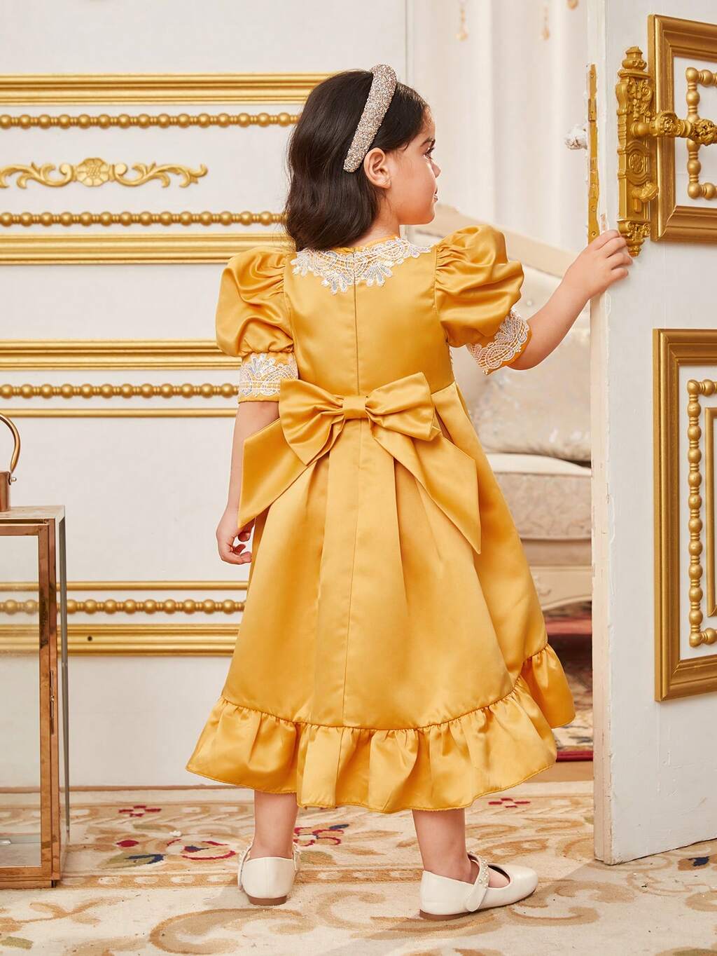 Tween Girls' Round Neck Dress With Lace Decorated Ruffle Sleeve And Hemline, Gold Foil Detailing