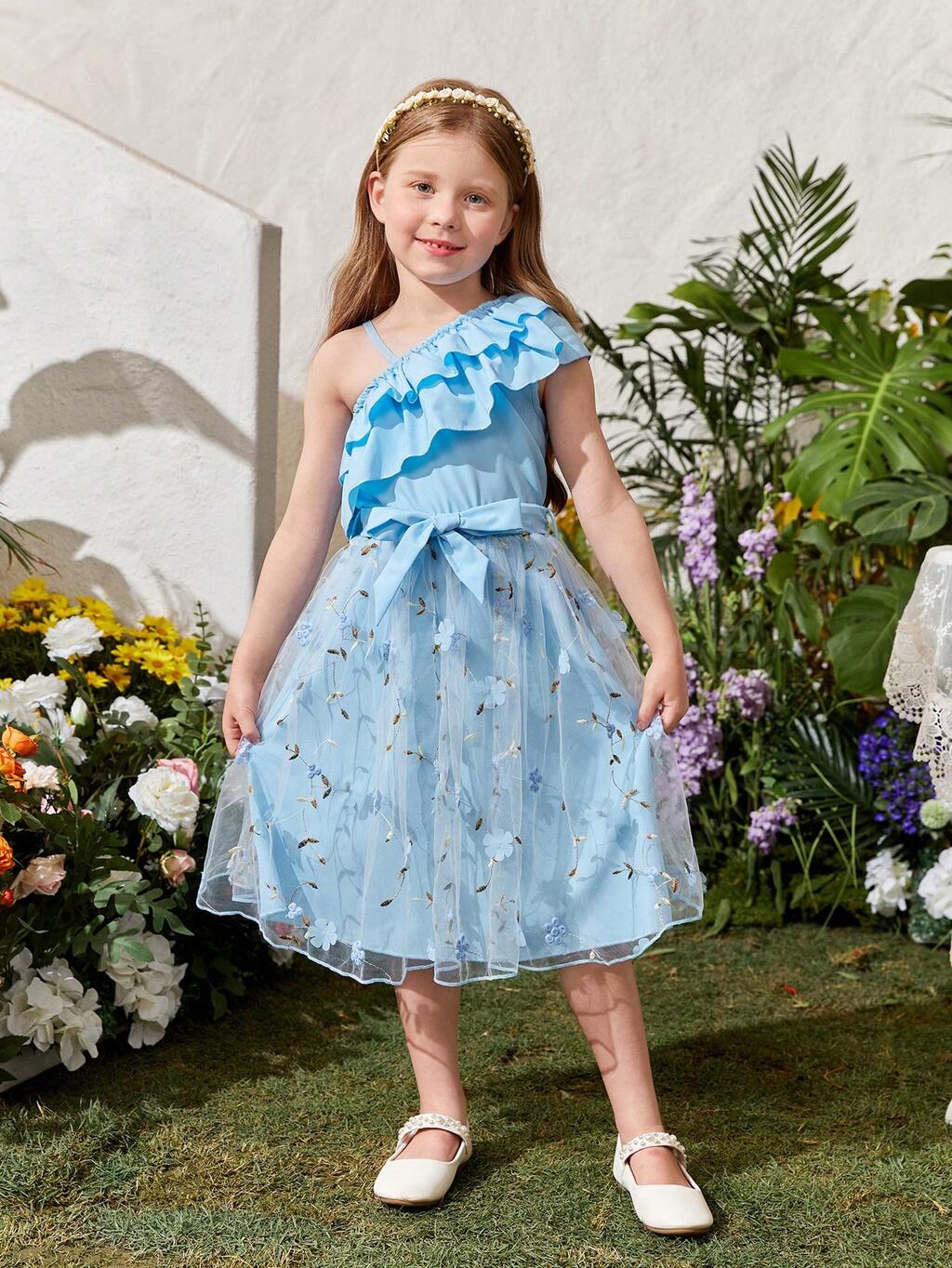 Young Girls' Embroidered Mesh Dress With Color Blocking And Ruffle Trim