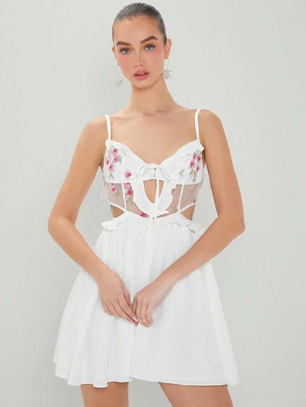 Floral Embroidered Hollow Out Spaghetti Strap White Summer Dress