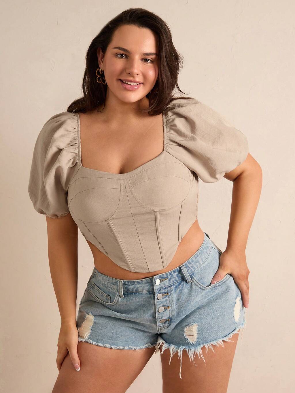 Plus Size Women's Solid Color Rhinestone Collar Puff Sleeve Shirt
