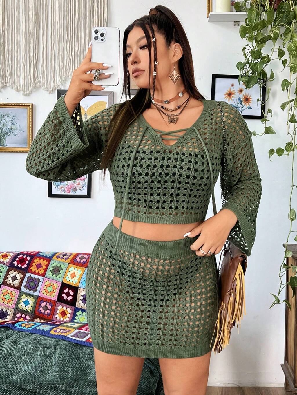 Plus Size Women's Fashionable Solid Color Hollow Crochet Lace-Up Swim Cover-Up Set