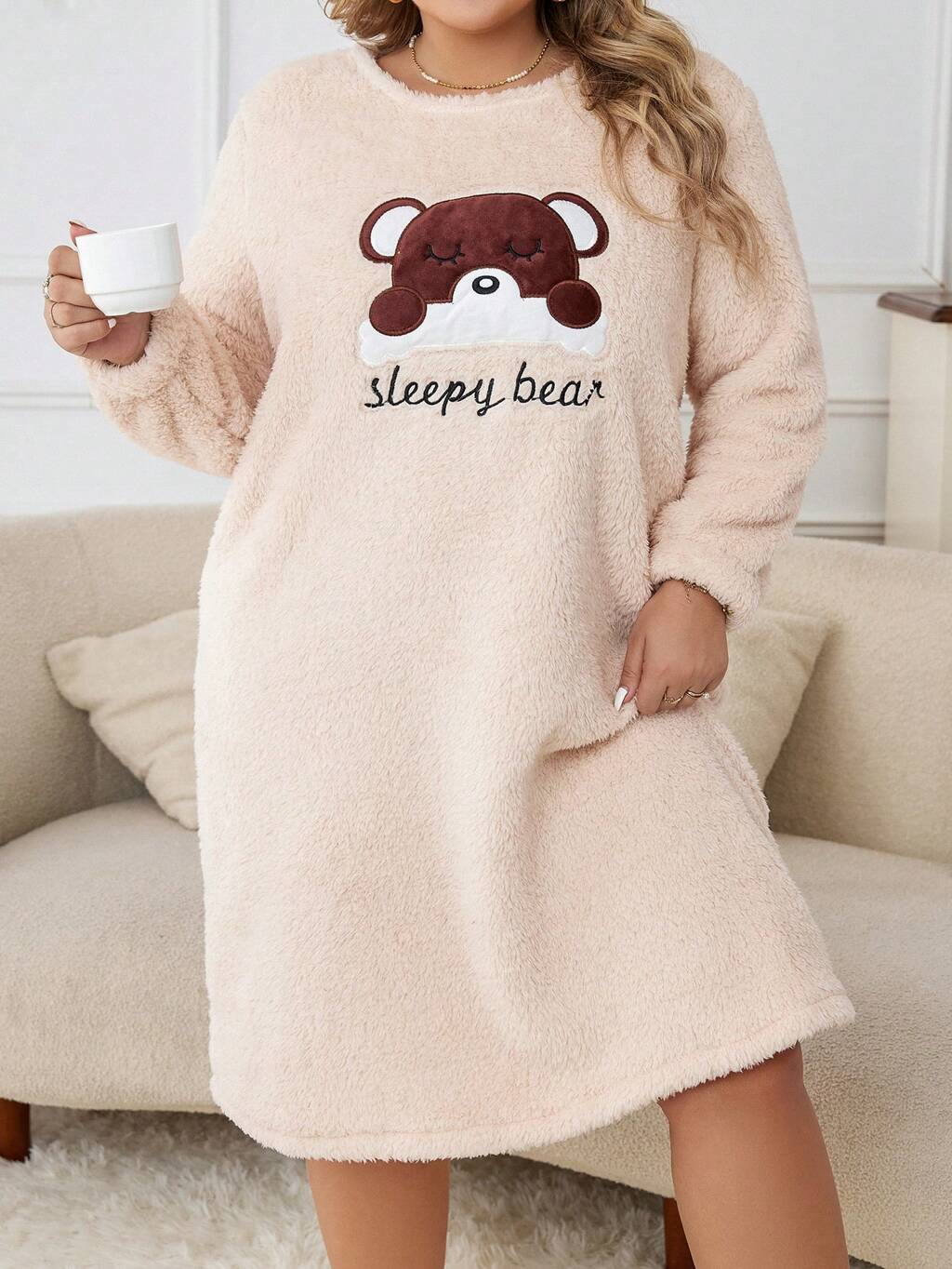 Plus Bear & Letter Embroidery Teddy Cozy Nightdress, For Fall Winter, Fluffy, Moo Moo Night Dress