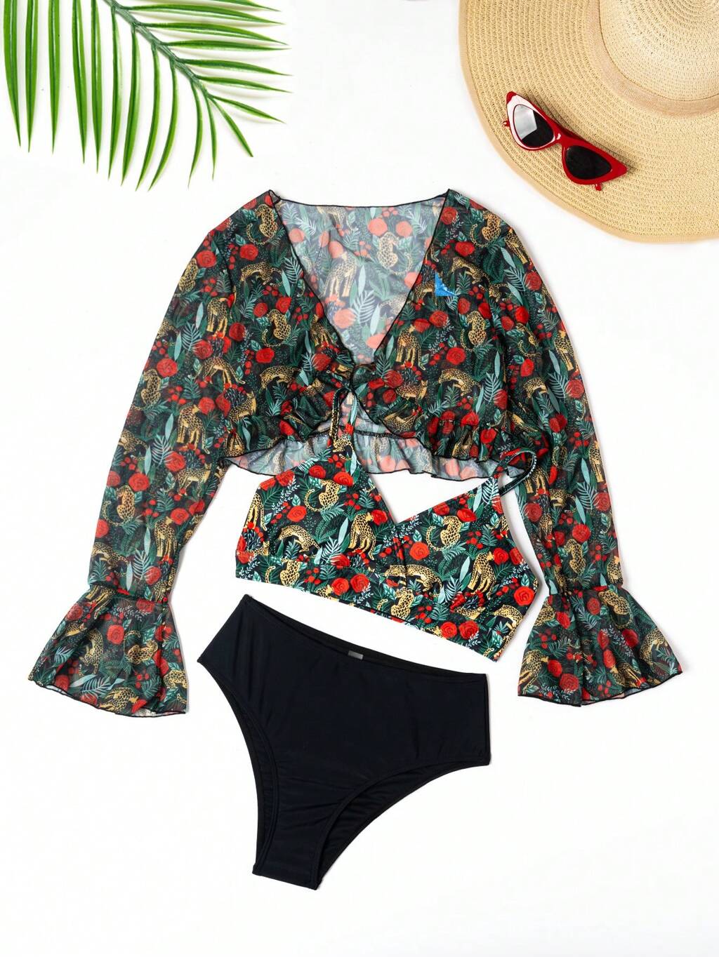 Teen Girl 3pcs/Set Random Printed Bikini Set + Ruffled Cover Up Top Summer Beach
