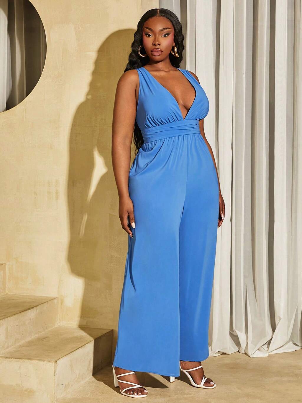 Plus Size Women's Solid Deep V-Neck Elastic Waist Ruched Details Jumpsuit, Perfect For Date Night, Suitable For Summer, Date Night, Birthday, Bachelorette Party Outfit, Casual, Shopping, Streetwear, Going Out, Vacation, Beach, Easy To Match&Looks Slim, Flatter The Figure