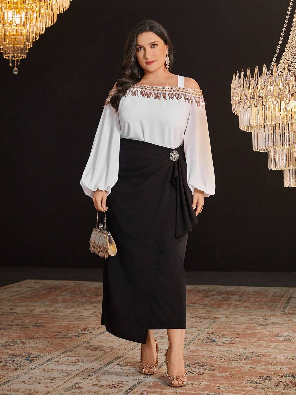 Plus Size Sparkly Sequin Open Shoulder Lantern Sleeve Top And Skirt Set With Colorblock Design,Elegant Evening Party Dress 2 Pieces Set