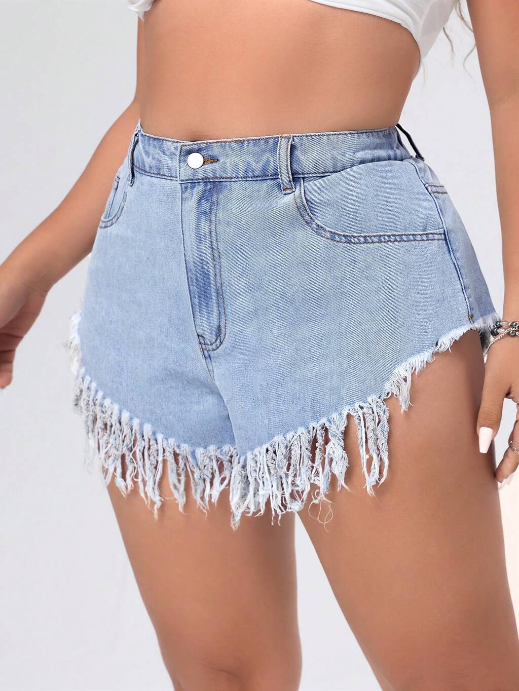Plus Size Denim Shorts With Frayed Hem And Diagonal Pockets