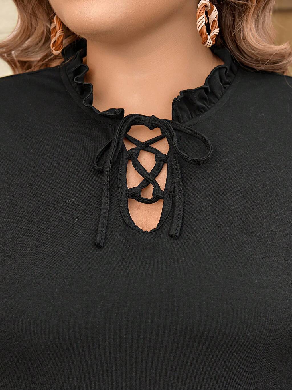 Plus Size Solid Color Ruffle Sleeve Embroidered Shirred Dress