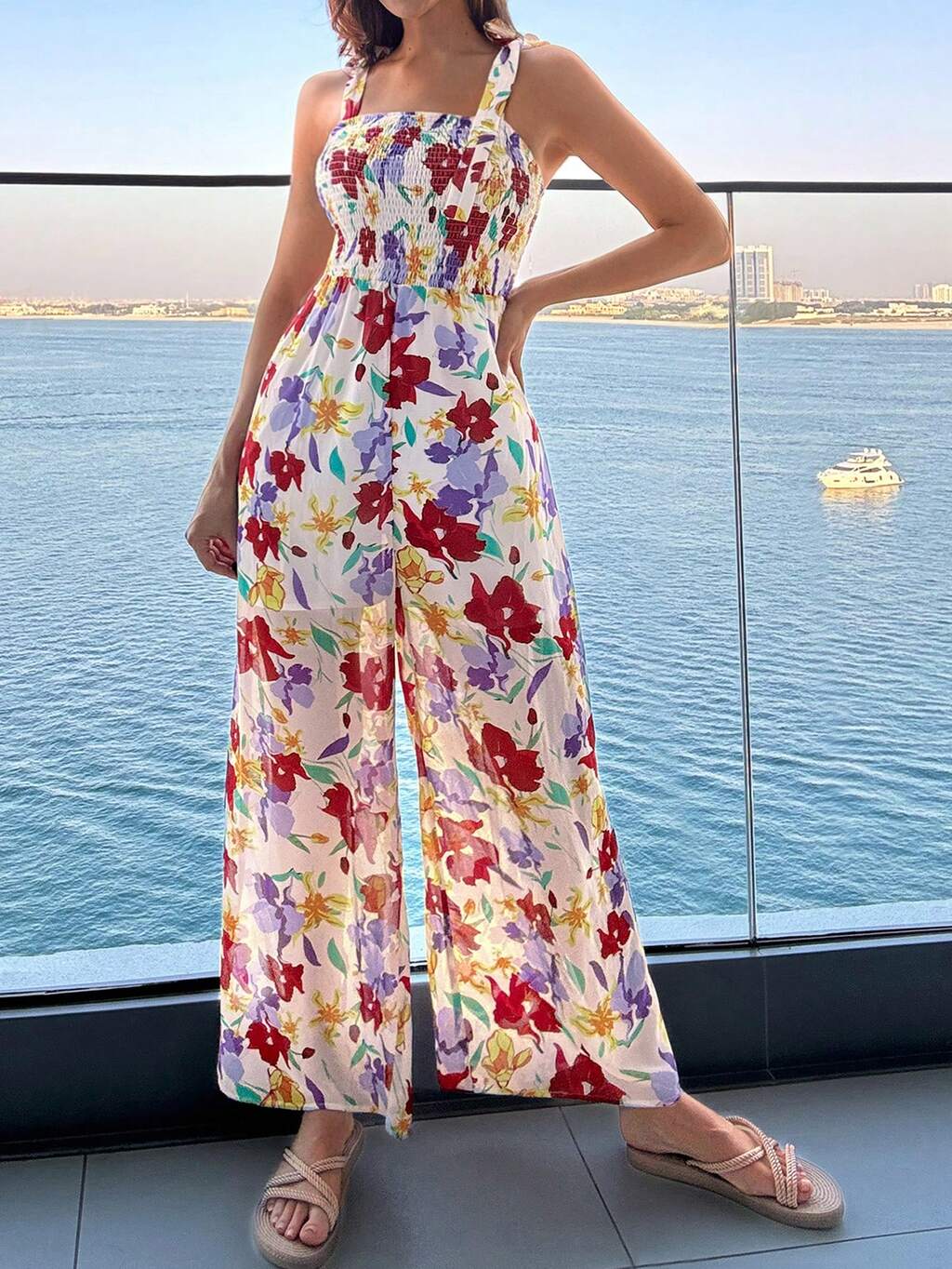 Vacation Print Bandeau Tie Waist Jumpsuit