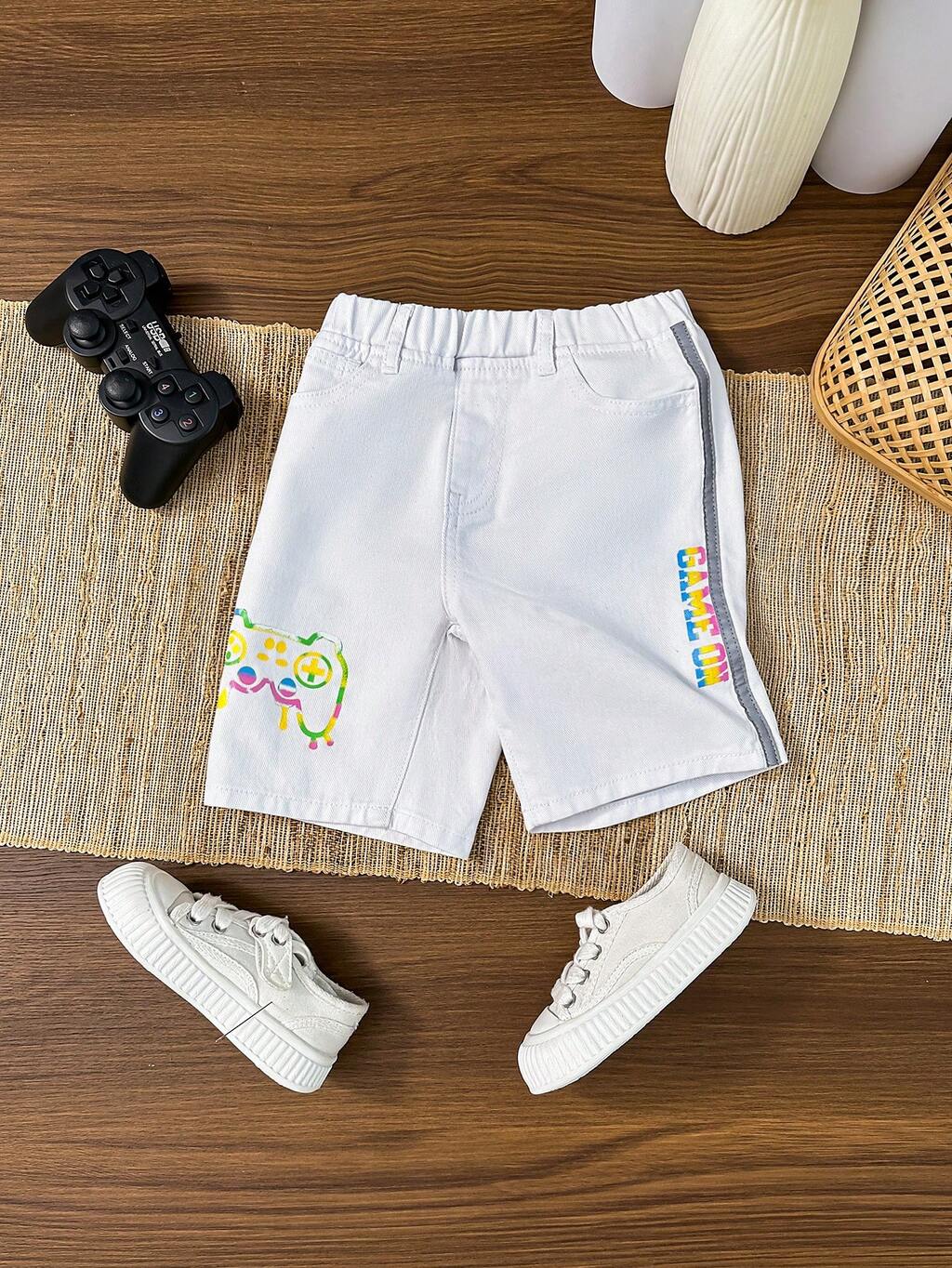 Young Boy Stylish Casual Comfort Baggy Denim Lettering And Game Print With Side Reflective Strip Design For Boys Shorts For Vacation And Dailywear