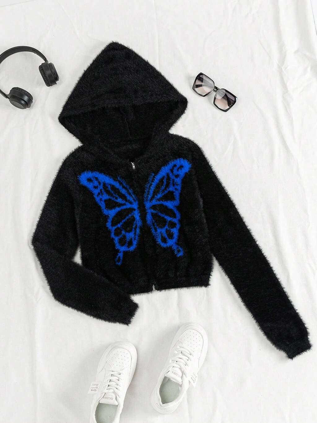 Women's Butterfly Pattern Hooded Fleece Zip-up Cardigan