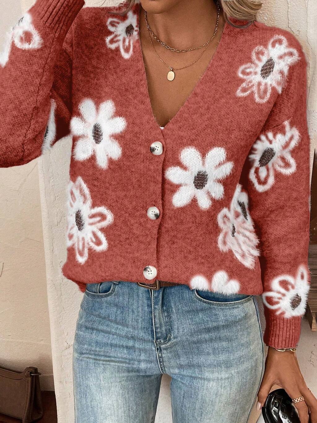 Floral Pattern Button Front Cardigan Fall Winter Cloth For Women, Christmas