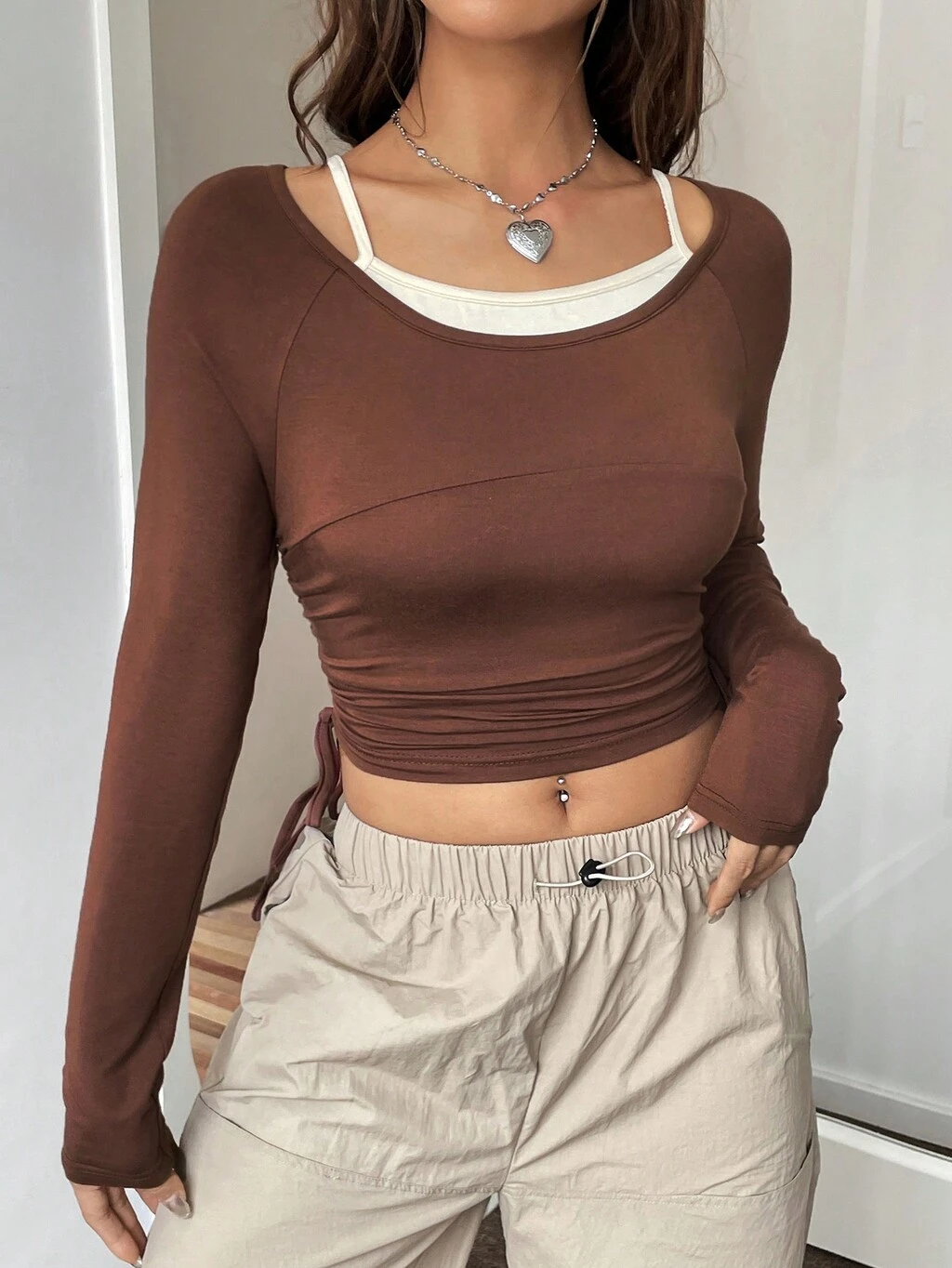 Lace Up Front Frill Trim Flounce Sleeve Bandana Hem Crop Blouse Fall Cloth For Women